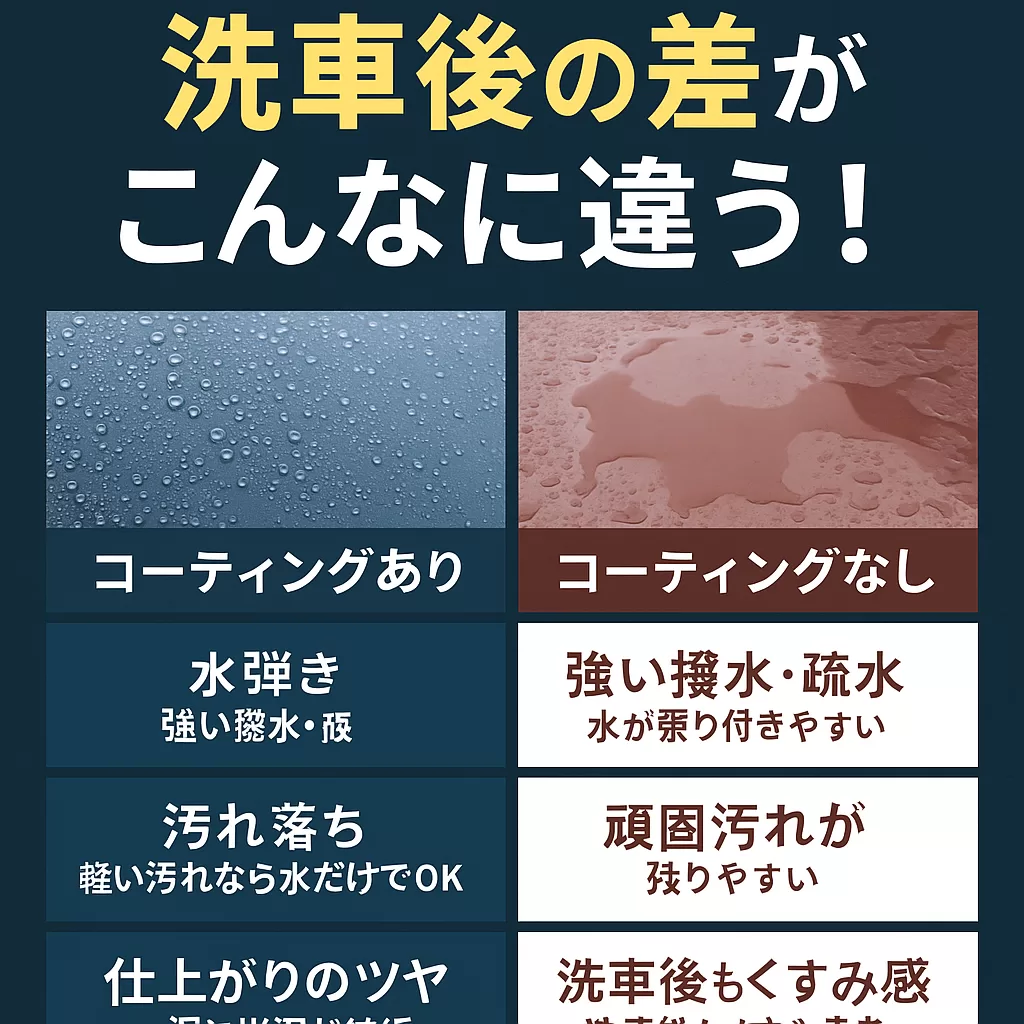 この記事では、コーティングあり・なしの車を同じ条件で洗車した際の違いを徹底比較。 見た目・汚れの落ちやすさ・水弾き・仕上がりの差など、写真付きでご紹介します。